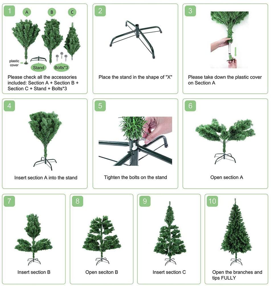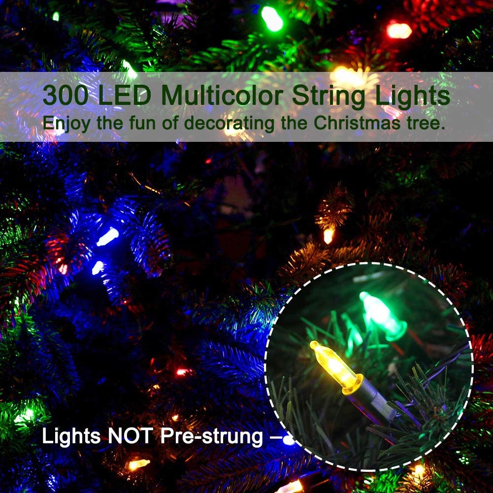 • Quick & Easy Assemble: Simple to set up, tree comes in three, slot-together sections and a metal stand is included. The branches drop easily into place requiring a small amount of 'tweaking' to create the fullest effect. You can quickly decorate the Christmas tree with 300 led NOT pre-strung green wire string lights.