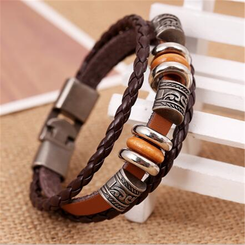 Vintage men's leather bracelet, wooden beads with multi-layer pendant, women's braided bracelet