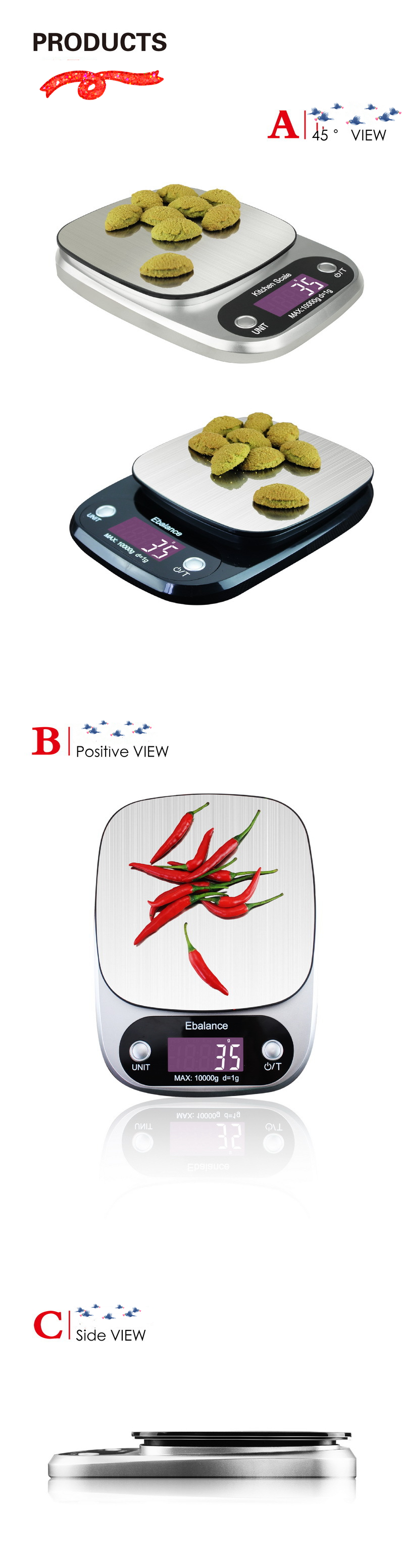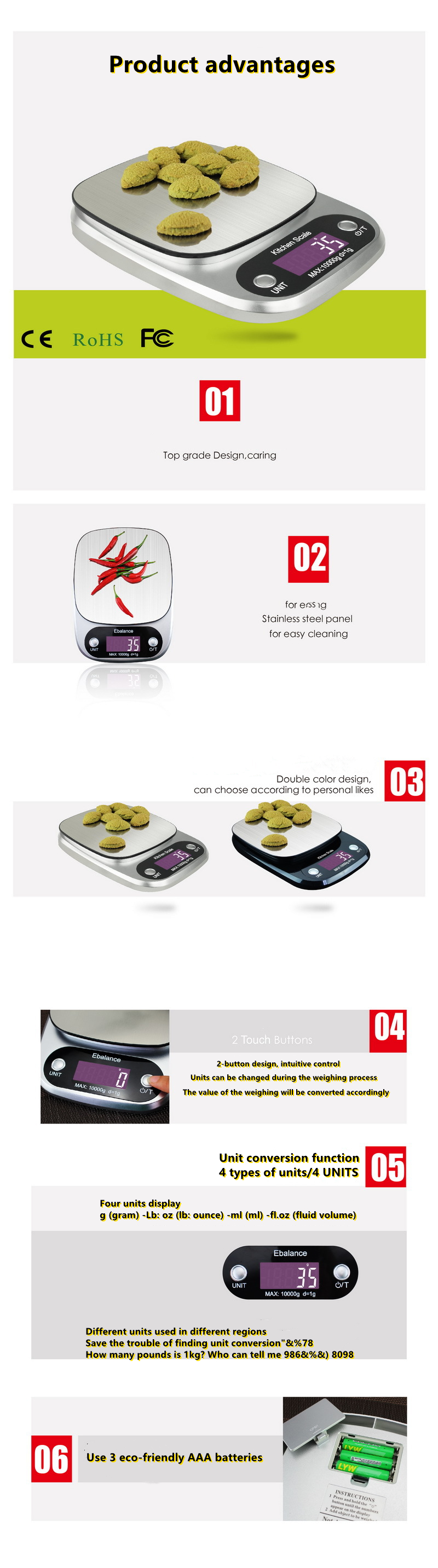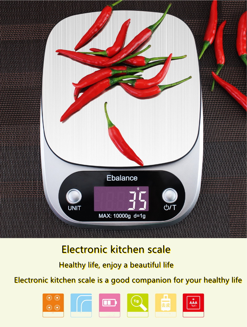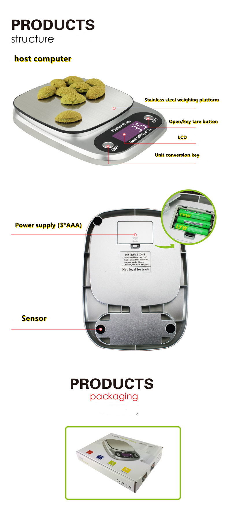 This is an ultra slim digital kitchen scale with stylish stainless steel weight surface. High precision sensor weighing 5kg/0.1g scale 0.1g division value 0.1g lcd display with negative white digital automatic zero point overload shutdown automatic tracking unit conversion switch alert easy to clean stainless steel weight surface this Item operates on three aaa batteries, which are not included.